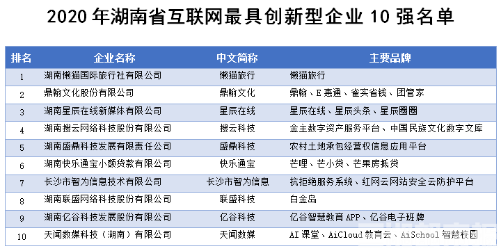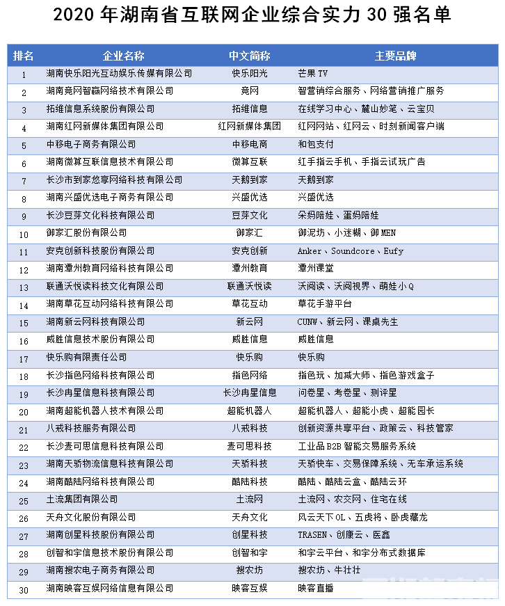 榜单显示,湖南快乐阳光互动娱乐传媒有限公司、拓维信息系统股份有限公司、御家汇股份有限公司等30家企业入选2020年湖南省互联网企业综合实力30强榜单;湖南懒猫国际旅行社有限公司等10家企业入选2020湖南省互联网最具创新型企业10强;湖南友阿云商网络有限公司入选2020年湖南省互联网最具成长型企业10强。