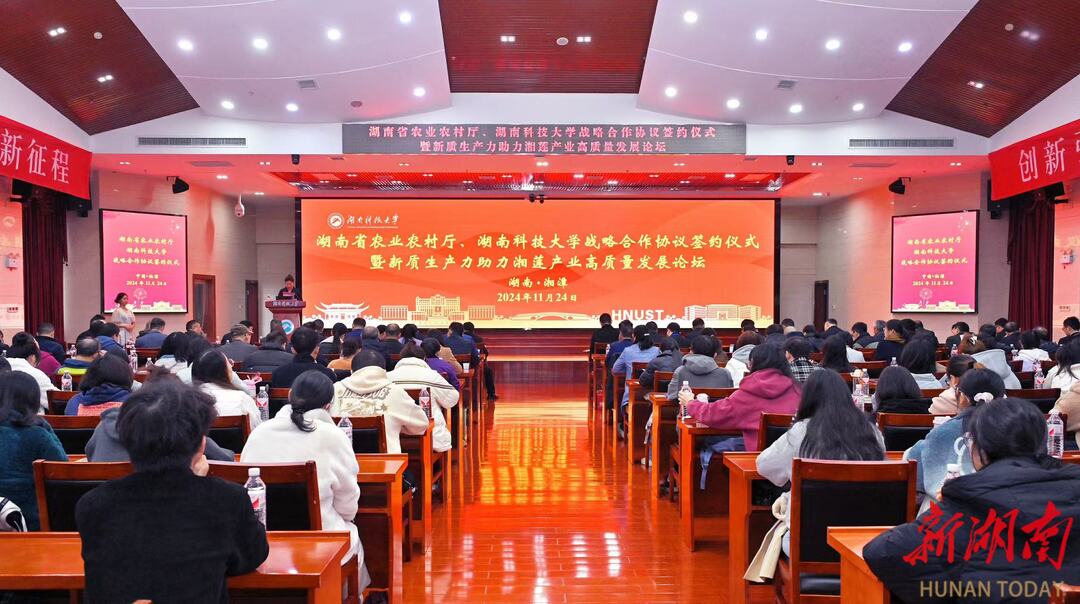 湖南日报11月25日讯(通讯员 唐亚慧 全媒体记者 杨斯涵)锚定“三高四新”美好蓝图,深化政产学研联动,加快建设农业强省。11月24日,湖南省农业农村厅、湖南科技大学战略合作协议签约仪式暨新质生产力助力湘莲产业高质量发展论坛举行,双方将以全面提升我省农业农村现代化水平和推进湖南科技大学创建国内一流、国际有影响的大学为目标,充分发挥各自优势,在共建现代智慧农业系统、共推湘莲特色产业发展、共享农村科技创新平台、助力和美“湘”村建设与规划、开展人才培养及教育合作等方面开展深入合作。