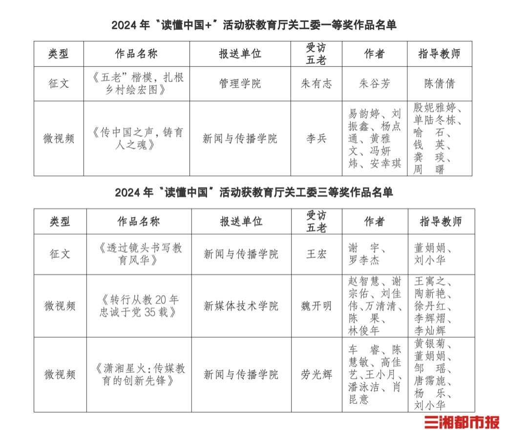 湖南日报12月27日讯(通讯员 杨乐 钱英 张辛蕤)近日,2024年全省普通高校“读懂中国”主题教育活动作品评选结果揭晓,湖南大众传媒职业技术学院关工委推荐选送的作品分获微视频类、征文类一等奖2项、三等奖3项,学校获评优秀组织奖。