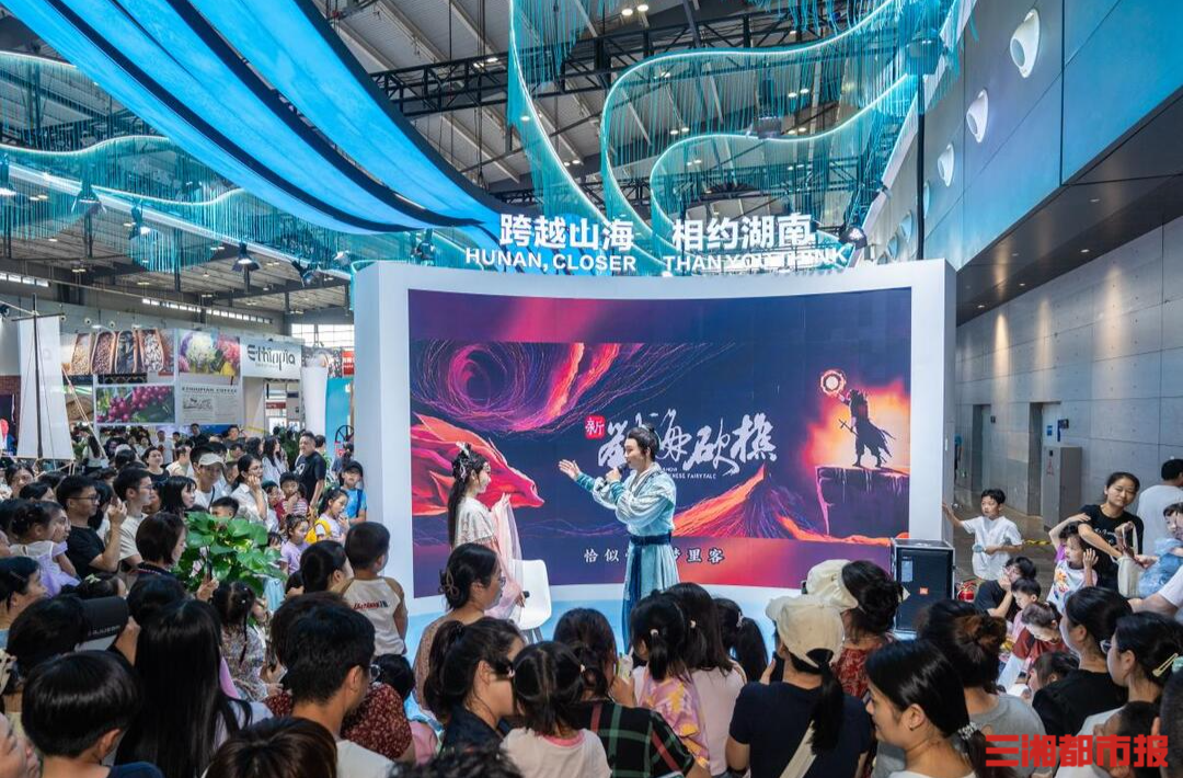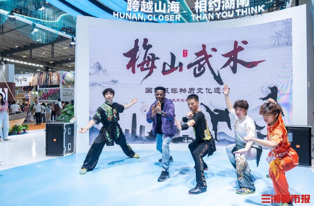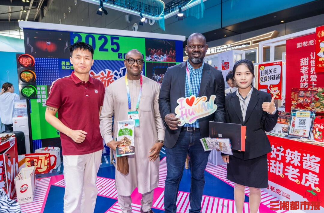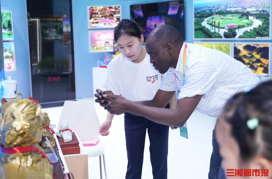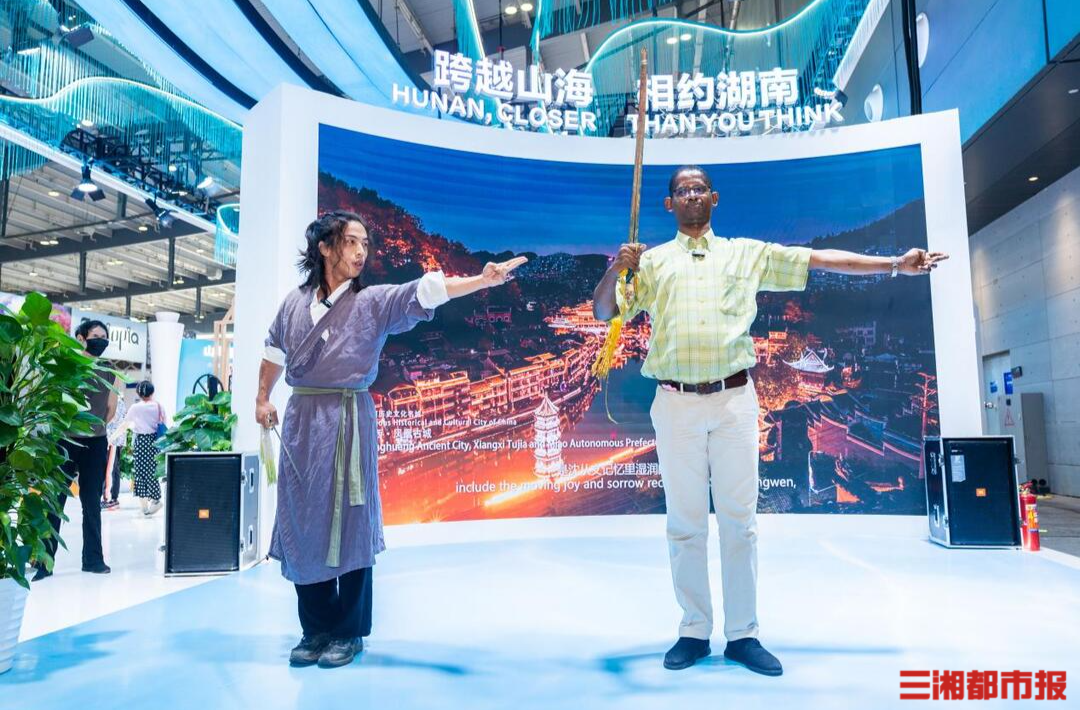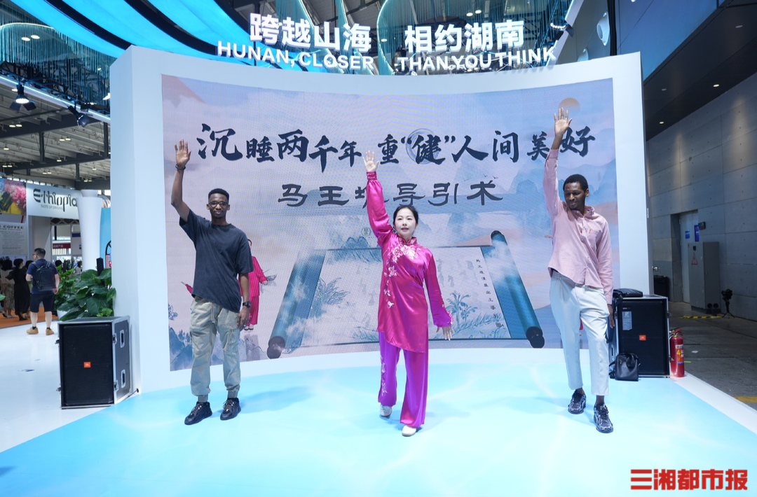 博览会期间,湖南文旅展厅见证了无数热情的瞬间:埃及客商为朋友挑选湘绣饰品,来自卢旺达的杜库说要把剁椒鱼头带回家乡,和父母来观展的孩子们学着做马王堆导引术,举手抬足间笑声清脆......