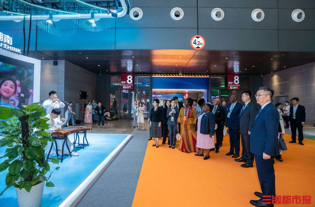 中非嘉宾观赏湖南文旅展厅展演节目。