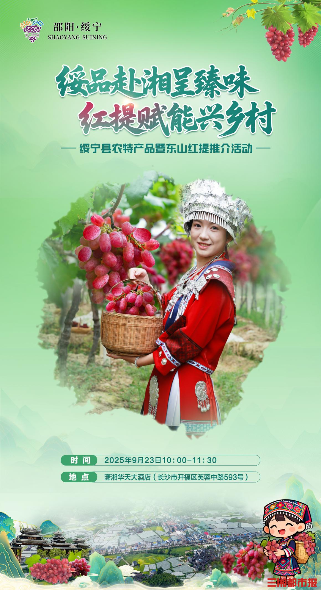 据了解,本次“绥品赴湘呈臻味,红提赋能兴乡村”绥宁县农特产品暨东山红提长沙推介活动由绥宁县委、县政府主办。活动还将同步开启多平台线上直播,并推出限时特惠、限量预售等系列促销活动。