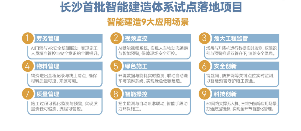 项目建立了一整套覆盖工程作业流程的智能监督系统,涵盖9大应用场景(劳务管理、视频监控、危大工程监管、物料管理、绿色施工、安全创新、质量管理、智能操控、科技创新)。比如工人安全帽佩戴识别、进场材料自动记录、施工过程可视化监测与预警等,实现管理可追溯、质量安全可管控。