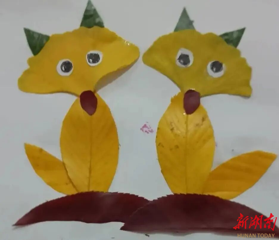课堂上,同学们深入观察银杏叶的扇形脉络、枫叶的锯齿边缘等自然特征,将其转化为艺术语言。有的同学用叶脉表现狐狸的毛发纹理,有的同学将黄绿红等不同颜色的叶子拼成叶片花束、树木,有的同学直接用叶片组装成了传统乐器琵琶,有的同学用叶片还原了社交媒体的“续火花”标识……在同学们的巧手下,它们不再是路边无人问津的枯叶,变成了这个秋天的“独家纪念”,既保留了自然美感,又充满着艺术的张力,被赋予了故事和温度。