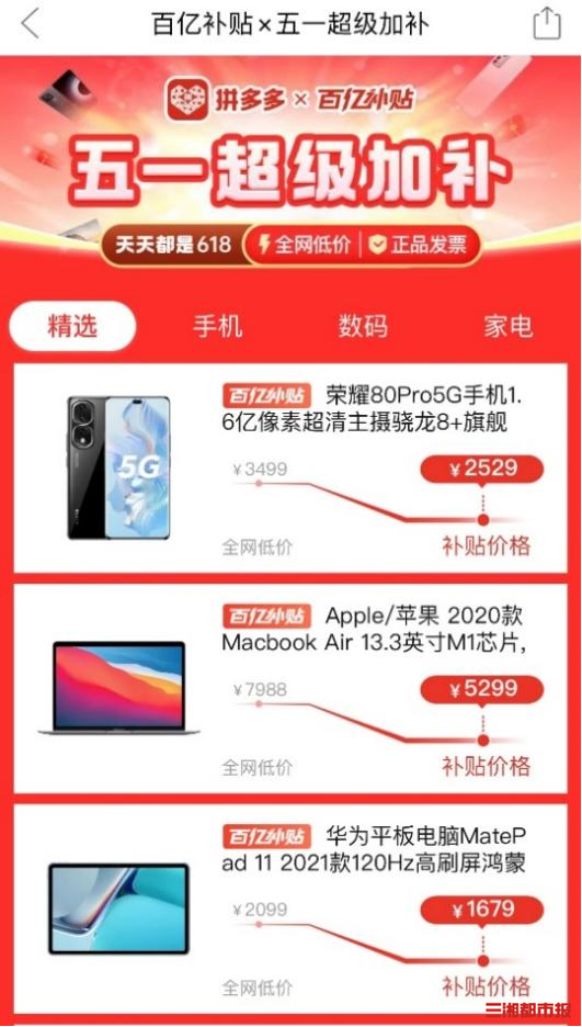 “五一”小长假在即,拼多多百亿补贴为回馈消费者,联合各大品牌启动“数码家电消费季:五一超级加补”专项活动,以近期最大的补贴力度,再次对手机、电视、空调、冰箱等各类数码家电产品进行大幅加补,抢占节日消费市场,持续激活消费潜力。此次活动已于4月28日20时正式上线,至5月3日20时结束,覆盖整个“五一”假期。
