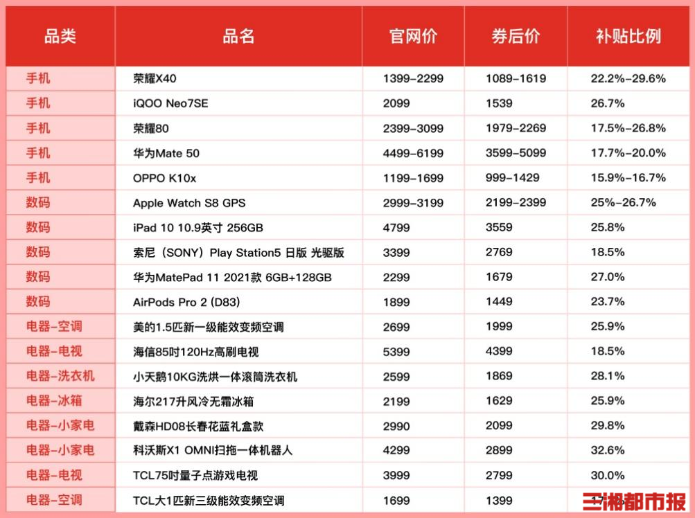 手机类产品仍是此次“五一超级加补”活动的热门。其中,官网价1399元起的荣耀X40券后降至1089元,官网价2099元起的iQOO Neo7SE券后价为1539元,补贴力度超26%;官网价2399元起的荣耀80券后降至1979元,最高补贴26%;官网价4499元起的华为Mate50券后降至3599元,补贴达到20%;官网价为1199元的OPPO K10x,券后则降至999元。