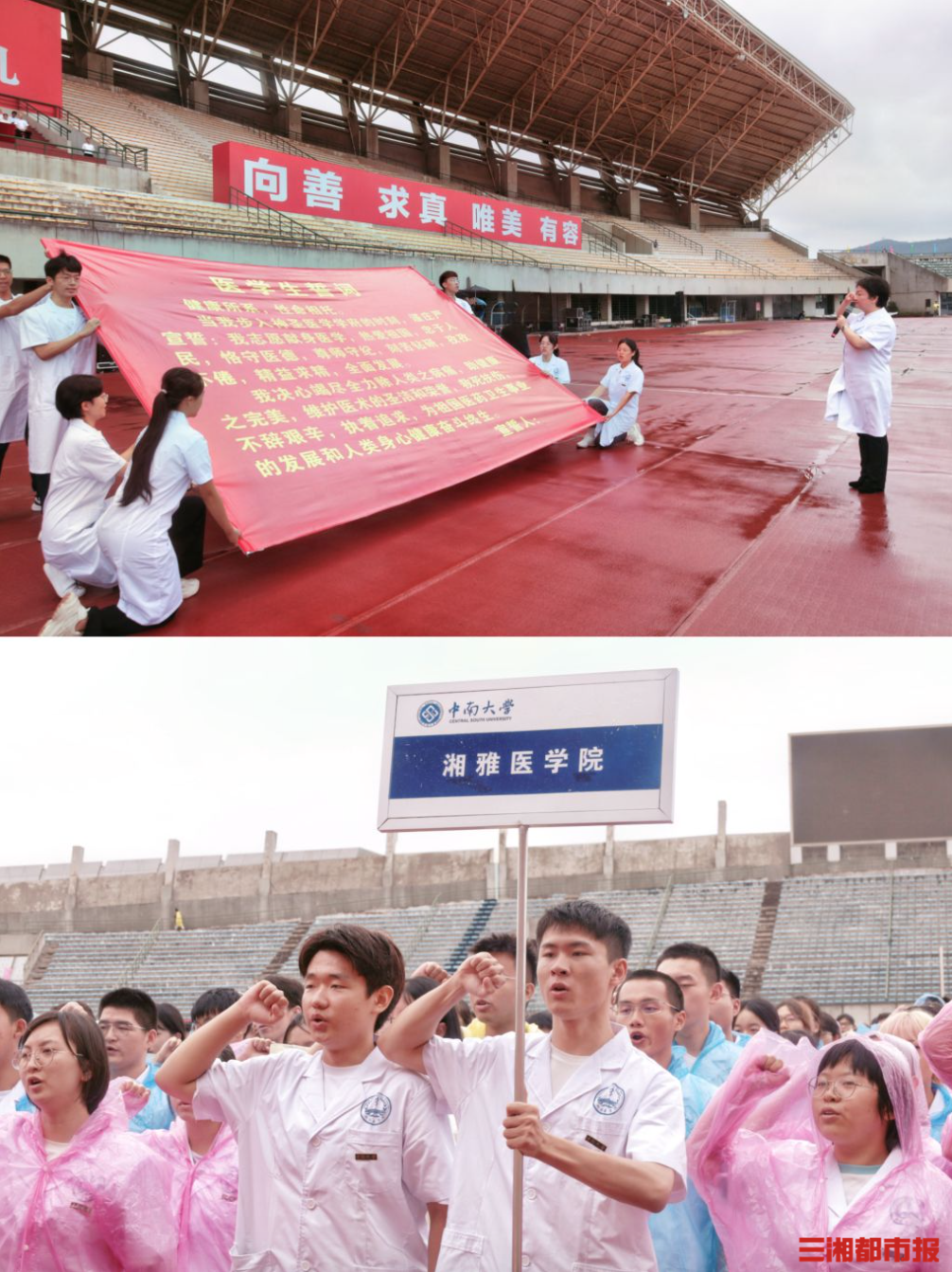 “我志愿献身医学,热爱祖国,忠于人民,恪守医德,尊师守纪,刻苦钻研,孜孜不倦,精益求精,全面发展……为祖国医药事业的发展和人类身心健康奋斗终生。”典礼上,全体医学新生在中南大学湘雅二医院张燕教授带领下,郑重宣读医学生誓词。