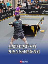 10月3日,北京大满贯混双赛前热身,王楚钦和孙颖莎对练,外协的球员都在远处静静观看。(视频:李青)