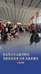 10月5日下午,张家界荷花国际机场与张家界西站候车厅内,响起悠扬的歌声与热烈的掌声。50多名青年志愿者带来了一场别开生面的“快闪”展演,用非遗表演、特色茶饮与节日祝福,为600多名游客送上了一份充满惊喜与温情的文化礼遇。(文/视频 全媒体记者 曾冠霖 通讯员 胡小宇)