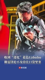 11月30日,谢霆锋澳门演唱会。有粉丝在台下送给谢霆锋一只穿着“进化T恤”的蓝色Labubu,谢霆锋收到后,迫不及待地往口袋里塞,发现塞不下后,急急忙忙放到后台去。(全媒体记者 李青)