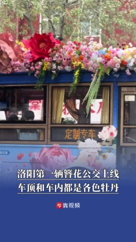 洛阳第一辆簪花公交上线,车顶和车内都是各色牡丹