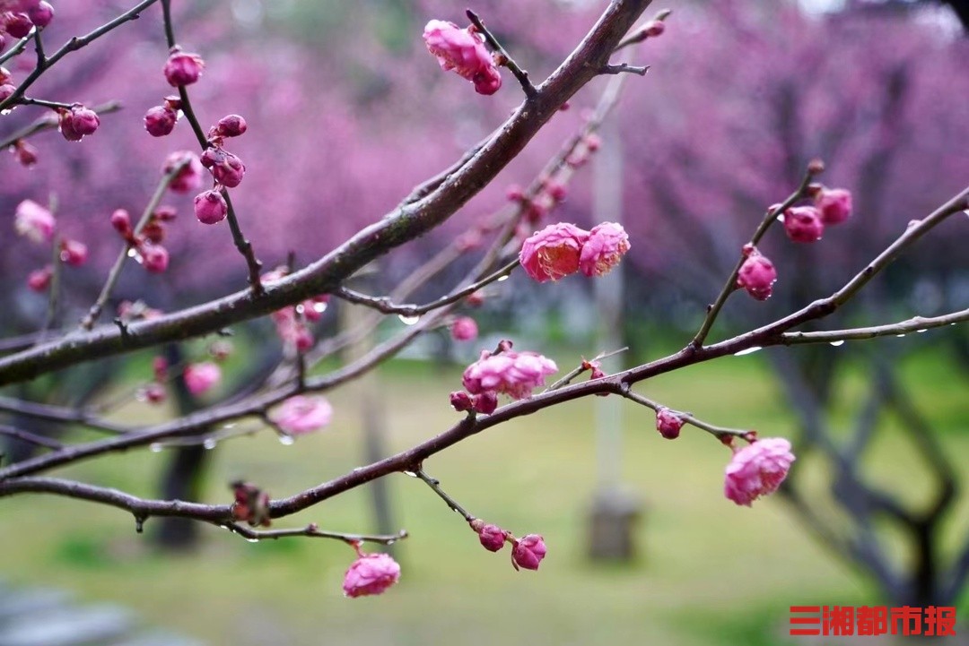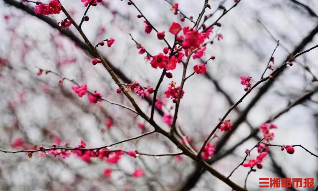 三湘都市报2月17日讯(实习生 黄诗淇 周蔚 摄)2月17日,长沙下着小雨,橘子洲头梅园的梅花在雨中盛开,红的白的争奇斗艳,带来早春的气息,淡淡的梅花香味引得游客们驻足拍照,雨中赏梅也别有一番风味。