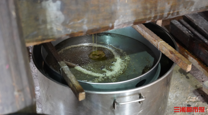 “我们油坊前几天才开榨,因为传统手工程序复杂,效率比较低,一条古老的木榨床每天只能榨出120斤左右的茶油,但是这样榨出来的茶油不含水份,所以保质期比普通茶油要长一些。”油坊负责人成锦华介绍道。