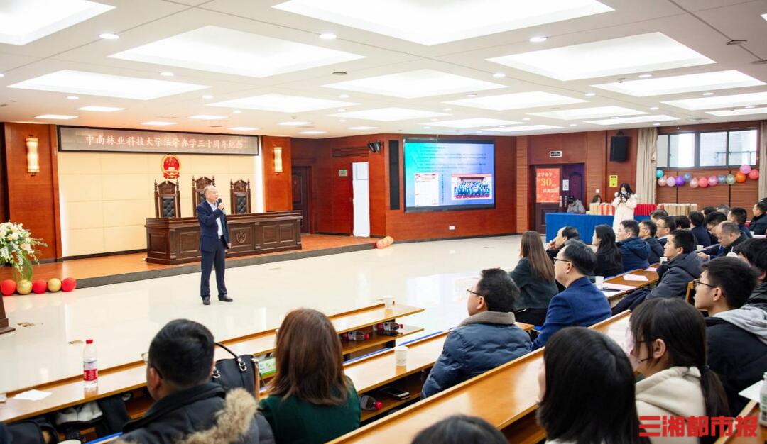 三湘都市报12月25日讯(通讯员 黄娟 全媒体记者 杨斯涵 黄京)三十年栉风沐雨,三十年春华秋实。12月23日,中南林业科技大学隆重举行法学专业办学三十周年纪念活动。来自省内高校和司法系统的领导嘉宾、校友及师生代表共聚一堂,一起回顾见证中南林业科技大学法学专业30周年的办学历程。