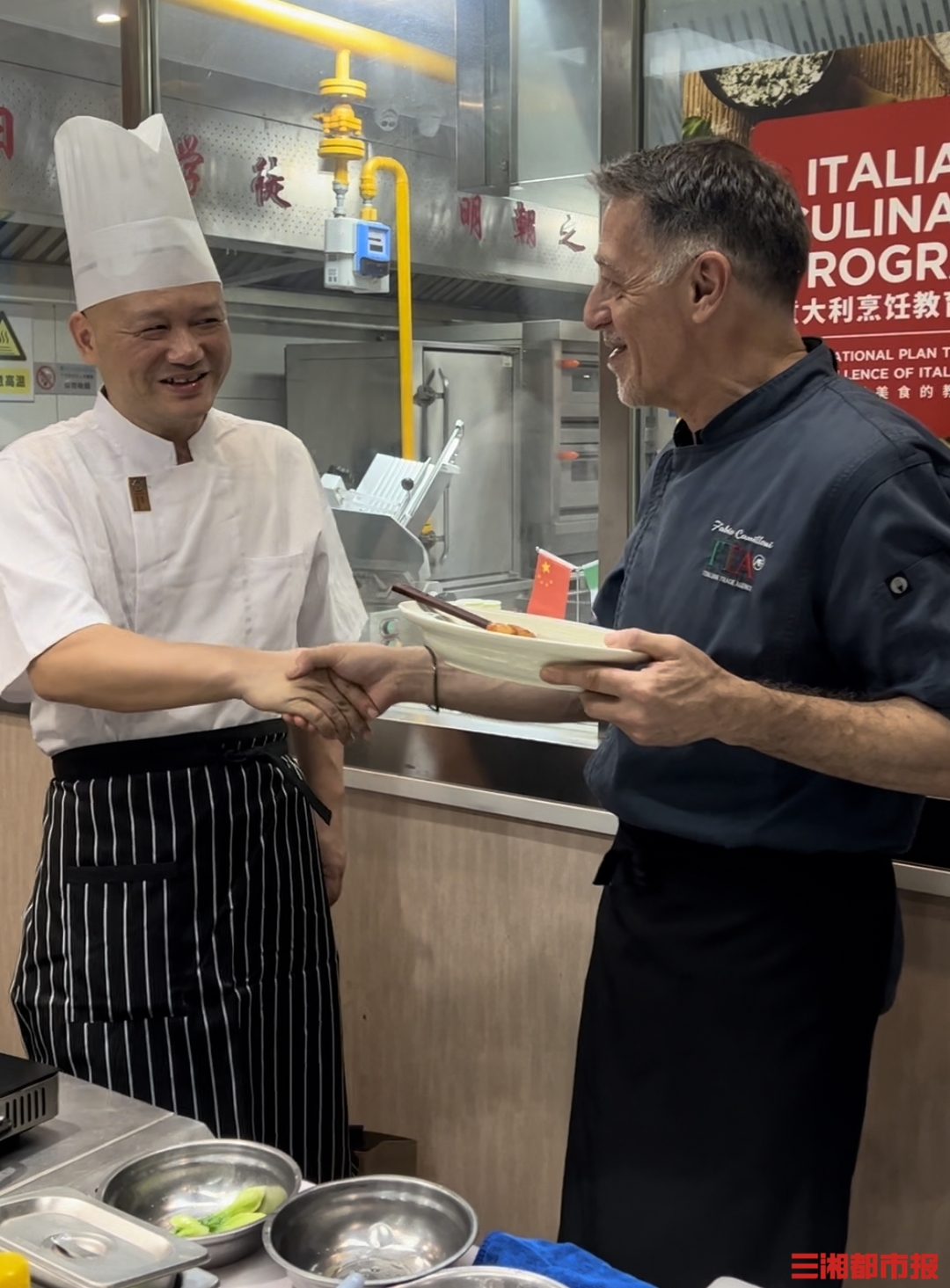 三湘都市报5月24日讯(通讯员 刘梓红 全永康 全媒体记者 杨斯涵 黄京)当湘菜红烧肉与意大利传统美食相遇,会有怎样的味蕾盛宴呢?5月23日,长沙商贸旅游职院举行意大利烹饪教育项目交流活动。活动中,该校湘菜学院副院长、中国烹饪大师、湘菜大师冯智雄现场演示了湘菜名菜蒜子五花肉的制作流程与工艺。意大利主厨法比奥则展示了传统肉丸搭配帕马森奶酪火锅、炸披萨和青酱螺旋面的烹饪技艺。两位大师的交流切磋,展现了中意两个美食大国各具特色的饮食文化。
