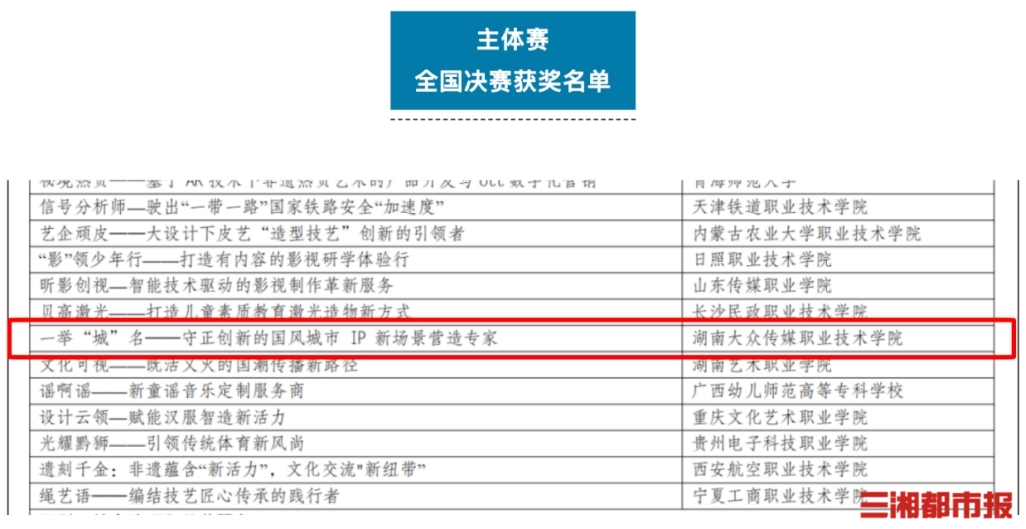 湖南日报11月18日讯(通讯员 杨乐 黄骊 张辛蕤 全媒体记者 刘镇东)近日,第十四届“挑战杯”中国大学生创业计划竞赛全国总决赛在西安闭幕,由湖南大众传媒职业技术学院推送的项目《一举“城”名—守正创新的国风城市IP新场景营造专家》在主体赛中斩获银奖,取得该校在此项比赛中的历史最佳成绩。