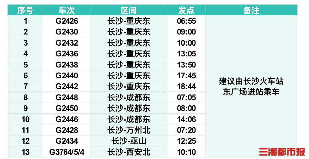 “渝厦高铁新增13对跨局列车,长沙中心城区首开高铁直达川渝。”长沙火车站工作人员告诉记者,随着渝厦高铁重庆东至黔江段的开通运营,渝湘高铁通道实现全线贯通,长沙中心城区前往重庆、成都等地更快速、更便捷。此次调图,长沙火车站在渝厦高铁方向新增13对高铁列车。具体包括长沙至重庆东7对、长沙至成都东3对、长沙至万州北1对、长沙至巫山1对、长沙至西安北1对。