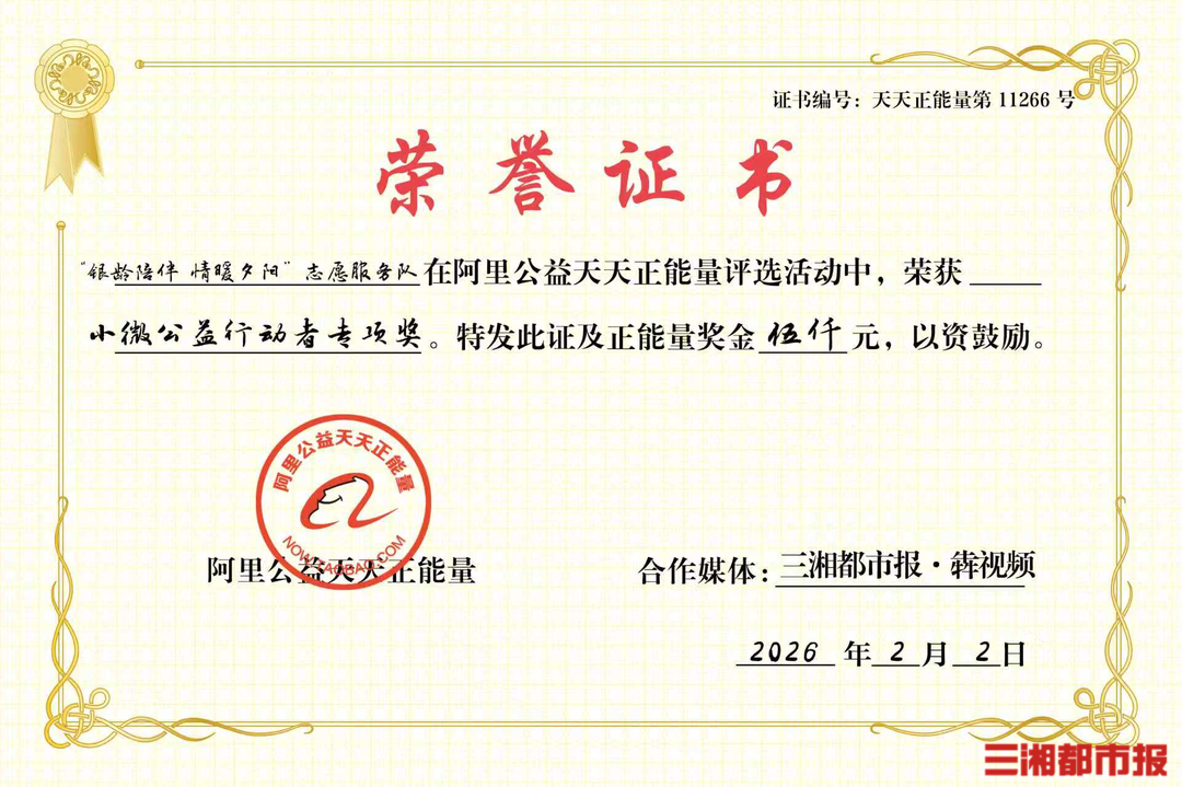 点赞不老善心,2月3日,三湘都市报·犇视频联合阿里公益天天正能量,为衡阳市模范好人“银龄陪伴 情暖夕阳”志愿服务队颁发小微公益行动者专项奖及5000元奖金。故事的“后续”同样动人,获奖的喜悦尚未散去,奖金已然找到最温暖的去向。