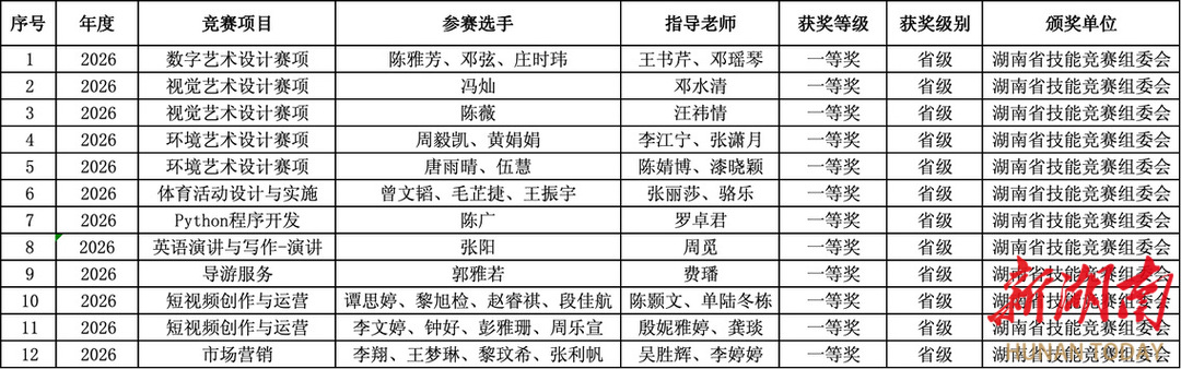 湖南日报2月14日讯(通讯员 王辉 全媒体见习记者 沈可心)近日,2026年“楚怡杯”湖南省职业院校技能大赛多个赛项落下帷幕。湖南大众传媒职业技术学院在此次比赛中表现突出,参赛的70支队伍、181名选手共获得46个奖项,其中一等奖12项、二等奖13项、三等奖21项。