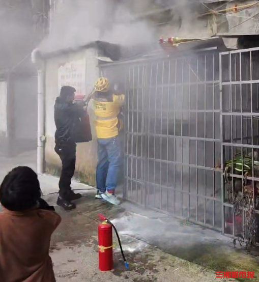 着火的房屋大门紧闭,屋内没人,旁边就是商铺和宾馆,火势若不及时控制,更多住户及商铺将被殃及。有人从家里拿来灭火器,赵正接过灭火器就冲了上去,拔销、对准火苗根部喷射,干粉从护窗反弹到他脸上也顾不上擦,灭火器一瓶用完马上换另一瓶。另外一名热心市民提着灭火器赶来,两人接力用光了12个灭火器。
