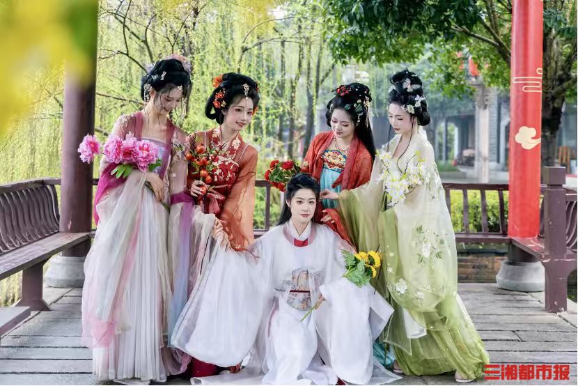 活动以“国色芳华大巡游、游园寻芳戏花神、春日焰火耀花朝、春歌缭绕醉春风、千机绘梦舞星河、汉服美拍映花颜、非遗演艺传古韵、千灯齐放祈春愿”为核心脉络,在园区打造八大主题体验内容,樱花、桃花等花海景观与铜官窑古建相映成趣,勾勒出独具韵味的春日画卷。身着精美华服的花仙子与花神 NPC穿梭园区,沉浸式还原花朝节传统盛景,与游客亲密互动合影,氛围感拉满。
