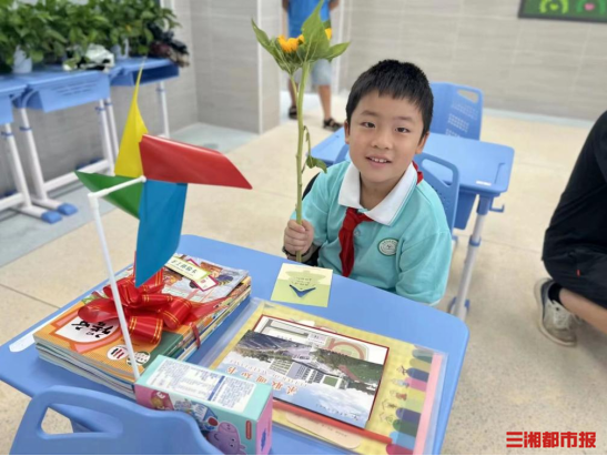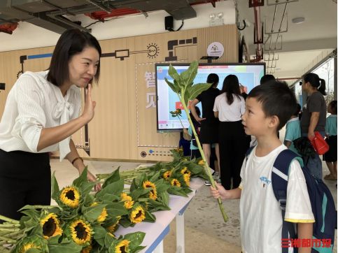 开学前一天,各班教室打扫得窗明几净,明亮的教室,整齐的课桌,精美的黑板报,扎着美丽的蝴蝶结的新课本……每处都体现了满满的仪式感。学校也准备了许多活动迎接朝气蓬勃的“小实子”们,陈校长给每个孩子都准备了向日葵,在门口亲切迎接孩子们的到来。