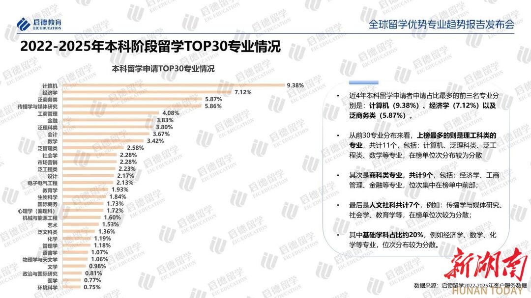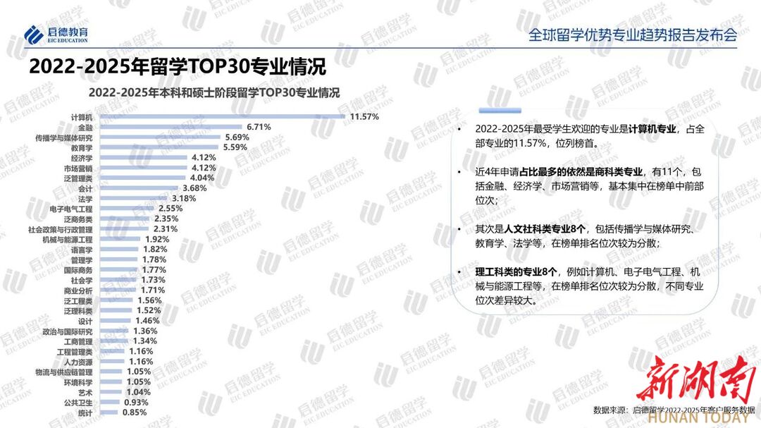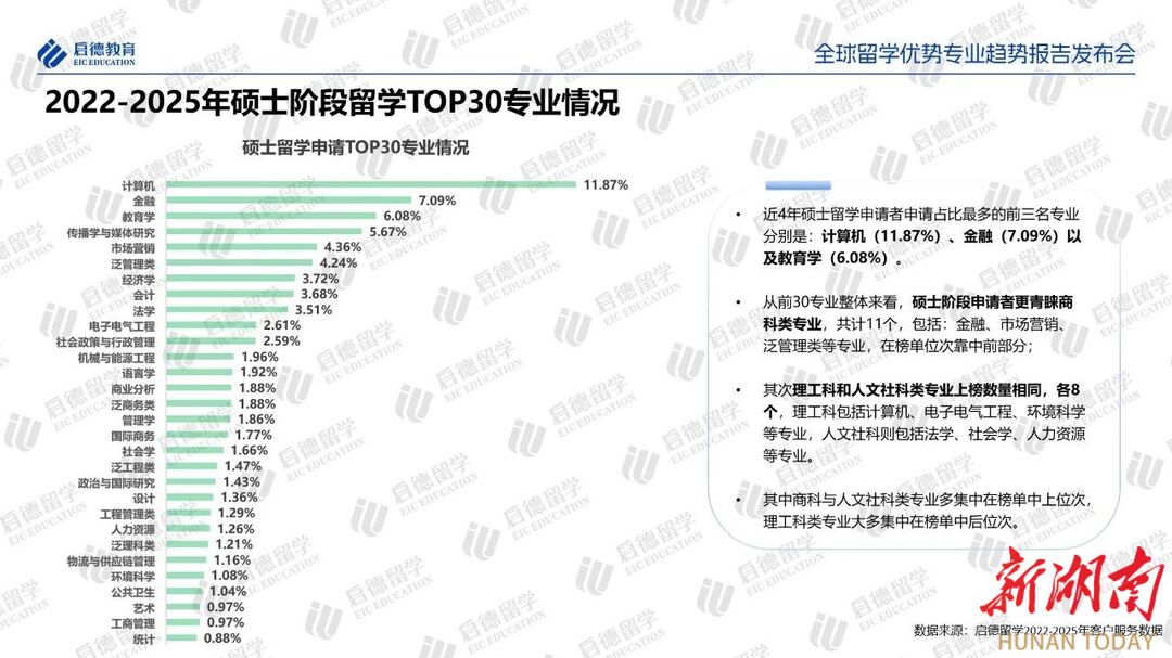 湖南留学专家、启德留学长沙分公司总经理李想介绍,在以就业为导向的驱动下,由于海归经历不再直接等同于高薪酬工作,许多学生和家长面对留学更为理性,申请出国留学人群同比有所下降。他建议,在专业选择上,准留学生们要多关注整个社会发展的大趋势和大方向,这样才利于今后的职场规划。“比如大健康、人工智能、大数据、生物科技、可持续能源等前沿领域,对高端人才需求迫切。另外,经管、人文社科等‘常青’学科也正与新技术、新经济深度融合,致力于培养具备综合素养与问题解决能力的复合型未来人才。”