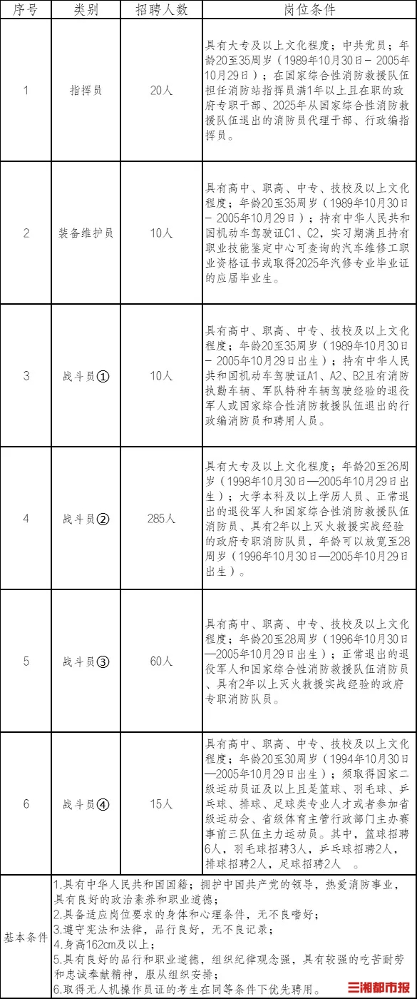 据了解,2025年长沙市共计招聘政府专职消防员400名,聘用人员培训考核合格后,在长沙地区(含长沙县、望城区、浏阳市、宁乡市)基层消防救援站担负执勤备战等任务。