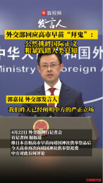 4月22日,外交部发言人郭嘉昆主持例行记者会。有记者问,据报道,继日本首相高市早苗向靖国神社供奉祭品后,今天高市再次向靖国神社供奉祭祀费。中方对此有何评论? 郭嘉昆表示,我昨天已经阐明中方的严正立场。日本涉靖国神社一系列消极动向公然挑衅国际正义,粗暴践踏人类良知。中方对上述恶行十分愤慨,严厉谴责。(剪辑 匡萍)