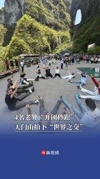 4月19日(发布日期),湖南张家界天门山。一群年轻人躺下拍照,4名外国人开团秒跟一起拍下“世界之交”的照片。(剪辑 全媒体记者 李青)