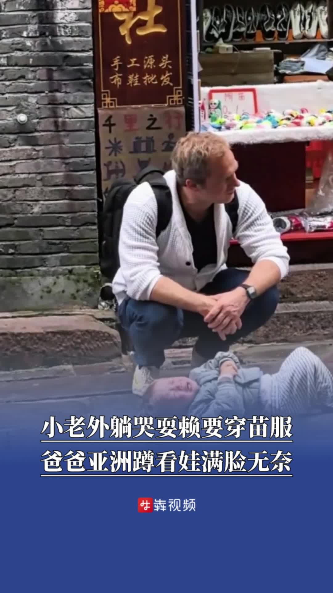 小老外躺哭耍赖要穿苗服,爸爸亚洲蹲看娃满脸无奈