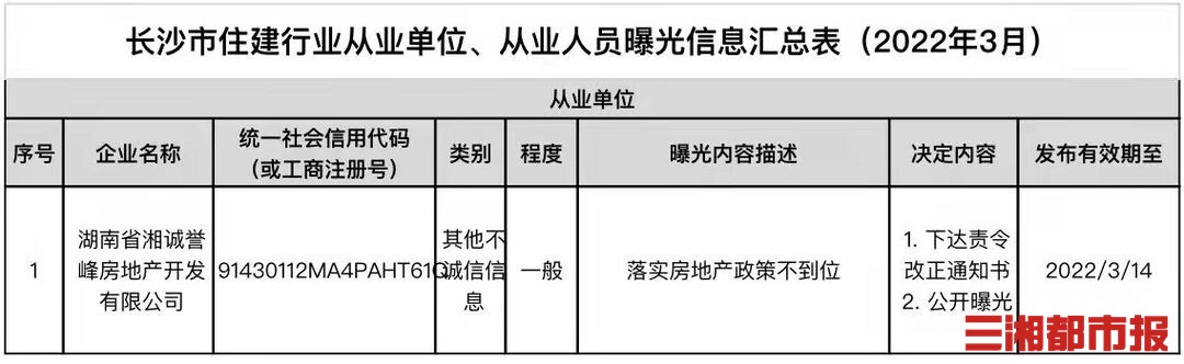 三湘都市报3月14日讯(全媒体记者 卜岚 实习生 周逸婷)今日,长沙市住建局公布了一批不诚信行为。湖南省湘诚誉峰房地产开发有限公司被曝光,并被下达了责令整改通知书。原因是落实房地产政策不到位。