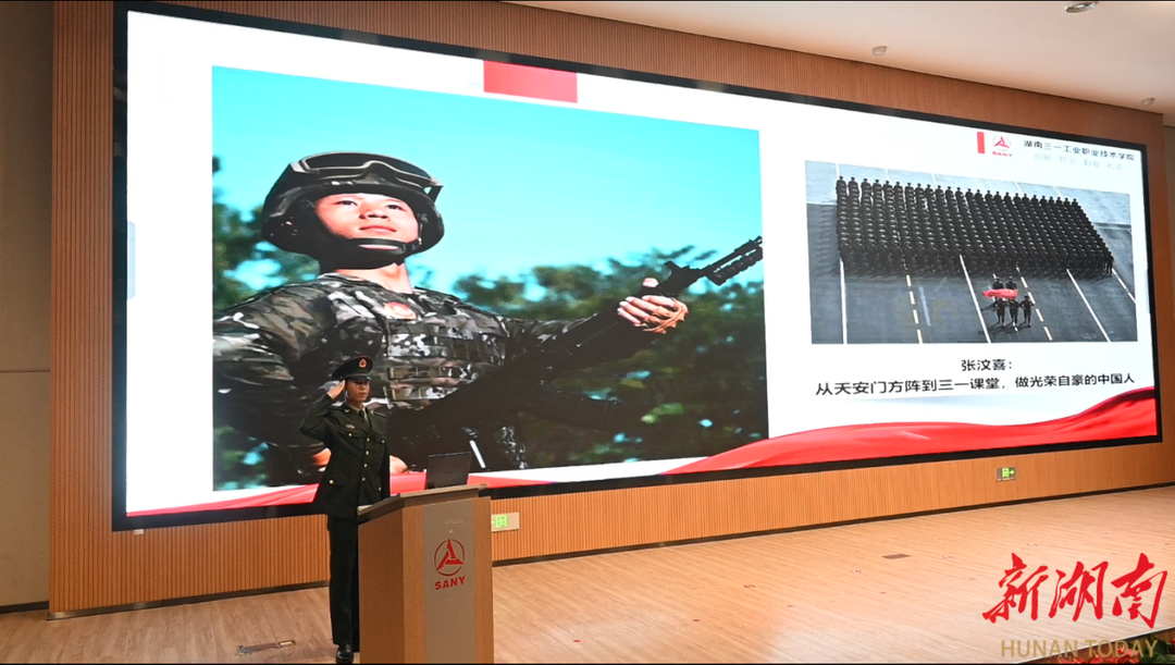 “当我的脚步声回荡在天安门广场,当目光掠过观礼人群时,那种‘以挺拔姿态告慰先烈’的自豪感,我会记一辈子。”张汶喜的讲述饱含深情,而他退役后选择重返三一职院学技能强本领,更让学子们深受触动。“阅兵场上,三一高空摄影升降平台等‘大国重器’的亮相,让我明白守护家园不仅需要军装热血,更需要科技实力。”他表示,将以“产业报国”为理想,在课堂上深耕专业知识,未来用三一技术、三一匠心续写青年担当。