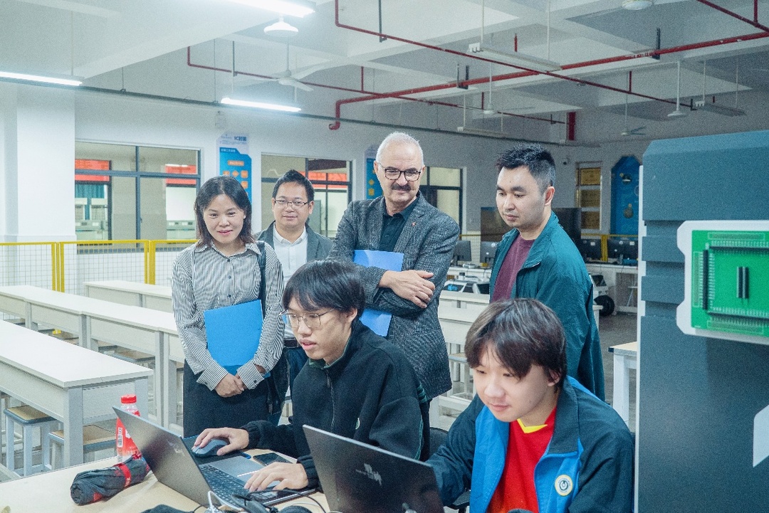 在该校云龙西校区轨道交通智能运维中心,Kamel Besbes教授兴致盎然地体验轨道交通工具模拟驾驶,在教师指导下熟悉操作流程、感受驾驶反馈,并就技术细节与教师交流;随后走进智能制造工业中心机器人、无人机实训室,他详细了解设备功能与运作原理,参与实操模拟,亲身体验技术应用过程。同时,双方围绕“技术落地应用”“产教融合模式”“国际化人才培养”等核心议题研讨,就未来合作方向达成初步共识。