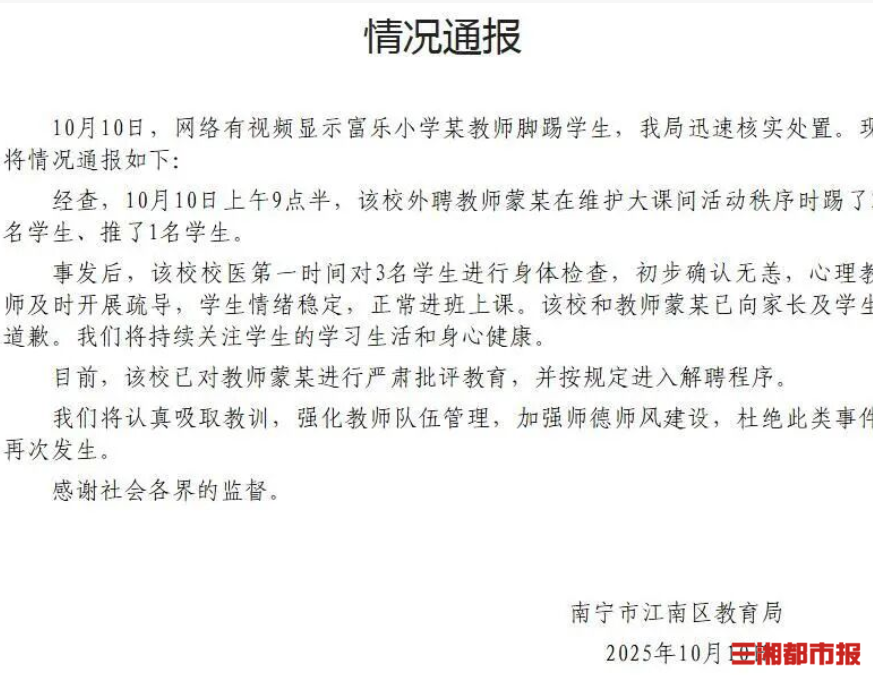 三湘都市报10月10日讯(全媒体见习记者 刘文) 10月10日,本报记者报道的“广西一小学老师踹飞两名学生”一事冲上热搜引发关注。10日晚,南宁市江南区教育局发布通报:经查,10月10日上午9点半,该校外聘教师蒙某在维护大课间活动秩序时踢了2 名学生、推了1名学生。事发后,该校校医第一时间对3名学生进行身体检查,初步确认无恙,心理教师及时开展疏导,学生情绪稳定,正常进班上课。该校和教师蒙某已向家长及学生道歉。将持续关注学生的学习生活和身心健康。