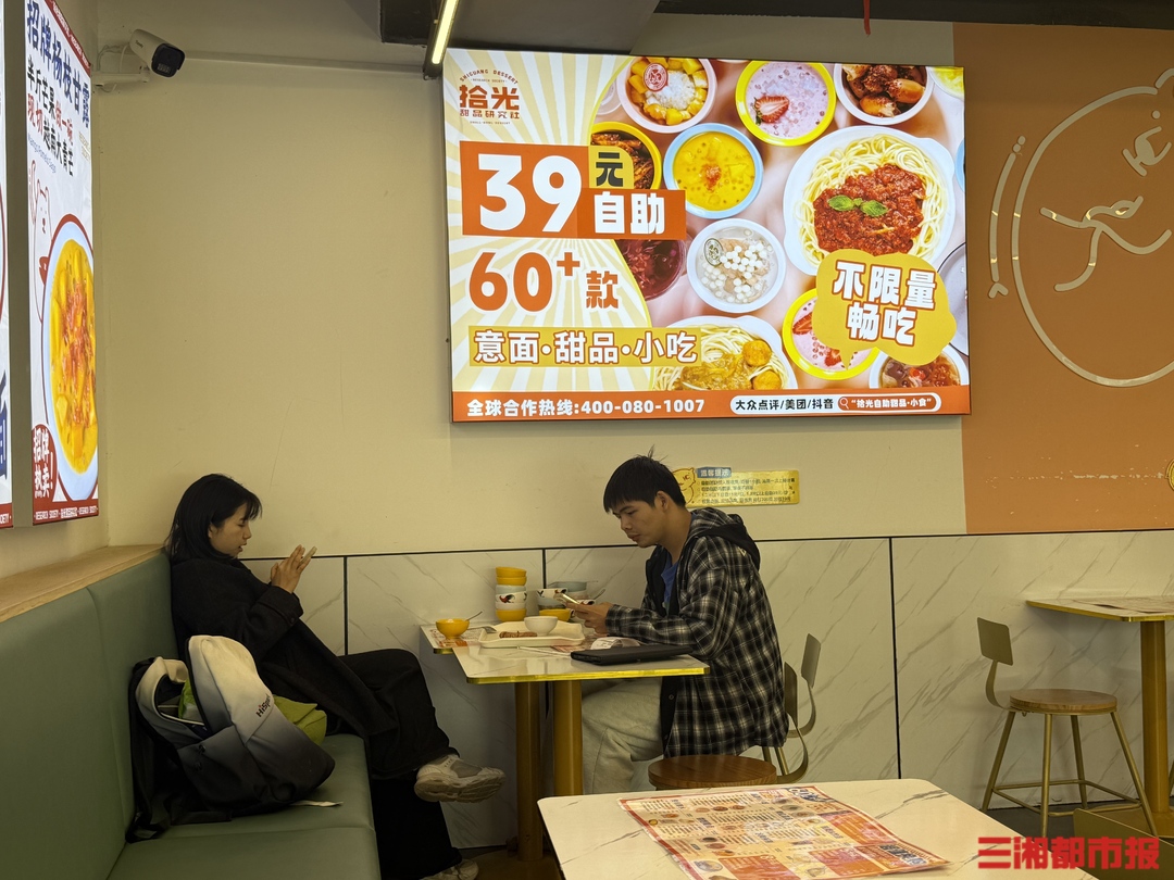 11月27日,在长沙五一广场,拾光自助甜品小食店的门前总能看到驻足咨询的食客,门口显眼位置摆放的“39元/人,意面、甜品、小吃不限量畅吃”招牌格外吸睛。“我们的餐品涵盖6大类70余个品种,从咸口的意面小吃到甜蜜的传统糖水,从网红甜品到冰爽饮品,能满足不同食客的口味需求。”店员热情地向记者介绍,除了39元自助套餐,门店还推出28元任选6样、58元选8样的灵活套餐,“不过,来店消费的食客,基本上会选择39元/人的自助餐,因为性价比高。”