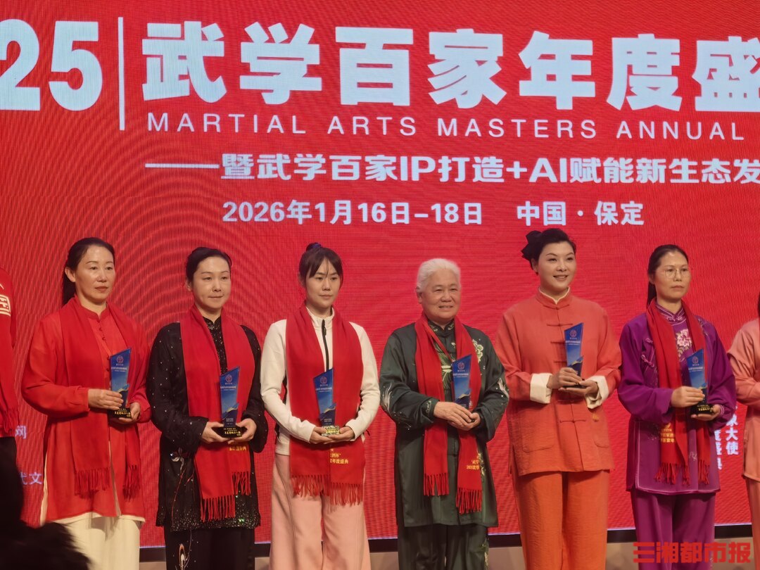 三湘都市报1月19日讯(全媒体记者 叶竹)国际八卦掌名家戈春艳、中国武术九段张茂清、国际级武术运动健将王晓楠、民建中央文化委员会副主任江涌等26组“武林高手”亮相……1月19日,记者获悉,2025武学百家年度盛典在河北保定举行,海内外武学名家、非遗传承人及武术同仁齐聚燕赵大地,以武会友。现场,中国武术泰斗张山门下弟子、湖南太极拳名家、国家级社会体育指导员张洁纯获评“2025武学百家年度影响力人物”。