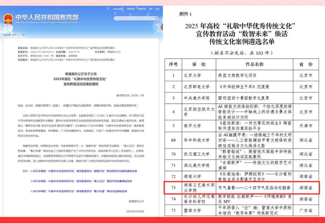 湖南日报3月6日讯(通讯员 何帅文 涂敏)近日,教育部办公厅公布了2025年高校“礼敬中华优秀传统文化”宣传教育活动结果。湖南工艺美术职业学院选送的作品《节气兽影——二十四节气民俗动态插画》成功入选“数智未来”焕活传统文化案例遴选名单。