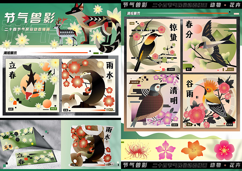湖南工艺美术职业学院此次入选的《节气兽影——二十四节气民俗动态插画》是一组以中国传统二十四节气为核心创作主题的插画作品。创作团队深入挖掘节气文化内涵,巧妙地将每个节气所对应的典型花卉与富有象征意义的动物元素相融合,通过插画艺术形式进行创意呈现。